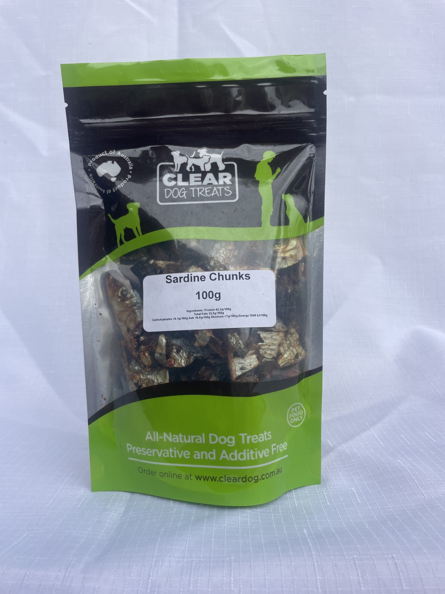 Sardine chunks dog treats weigh on average around 1-3g each. They are cut into small chunks size about 2x3cm a piece on average but can be a little outside of this. Some pieces can be very small and there will be a small amount of breakage and crumbs at the bottom of the bag.